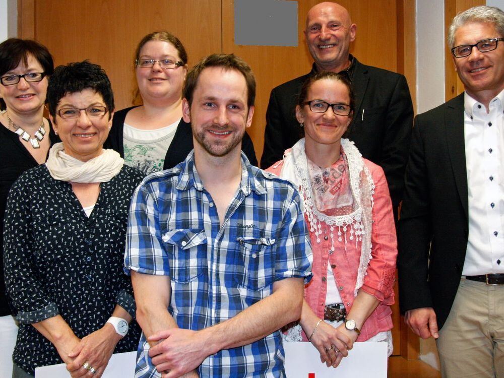 Bereitschaftsleiterin Daniela Heiler, Ilse Eisele, Janna Schreiber vom Kreisverband, Christoph Stelter, Tatjana Hagg, Vorsitzender Claus Dürr und Hohensteins Bürgermeister Jochen Zeller bei der Hauptversammlung. FOTO: LEIPPERT