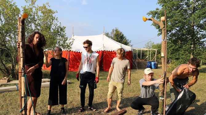 Rund 60 Helfer bereiten alles für das erste Connect-Festival auf dem Schachen vor. Die kleine Wunderwelt im Landschaftsschutzgebiet wird liebevoll gestaltet, dabei wird auch bei den mobilen Duschen keine Ausnahme gemacht. FOTO: BAIER