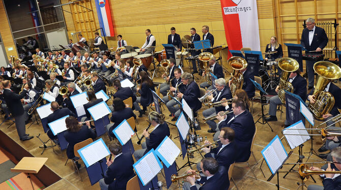 Die Stadtkapelle Münsingen hatte zu ihrem gelungenen Doppelkonzert die Stadtkapelle Pfullingen in der Alenberghalle zu Gast. An die 80 Musiker waren dabei auf der Bühne. FOTOS: BLOCHING