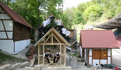 HAYINGEN. Angehende Zimmerleute der Kerschensteinerschule Reutlingen haben für das Naturtheater Hayingen ein Fachwerkgebäude als »Erste Hilfe-Häuschen« und Verkaufskiosk gebaut. Aufgrund persönlicher Kontakte von Daniel Schweiger zu den Lehrern Reiner Teufel und Michael Schwend kam es zu einer Zusammenarbeit des Naturtheaters mit der Reutlinger Berufsfachschule.