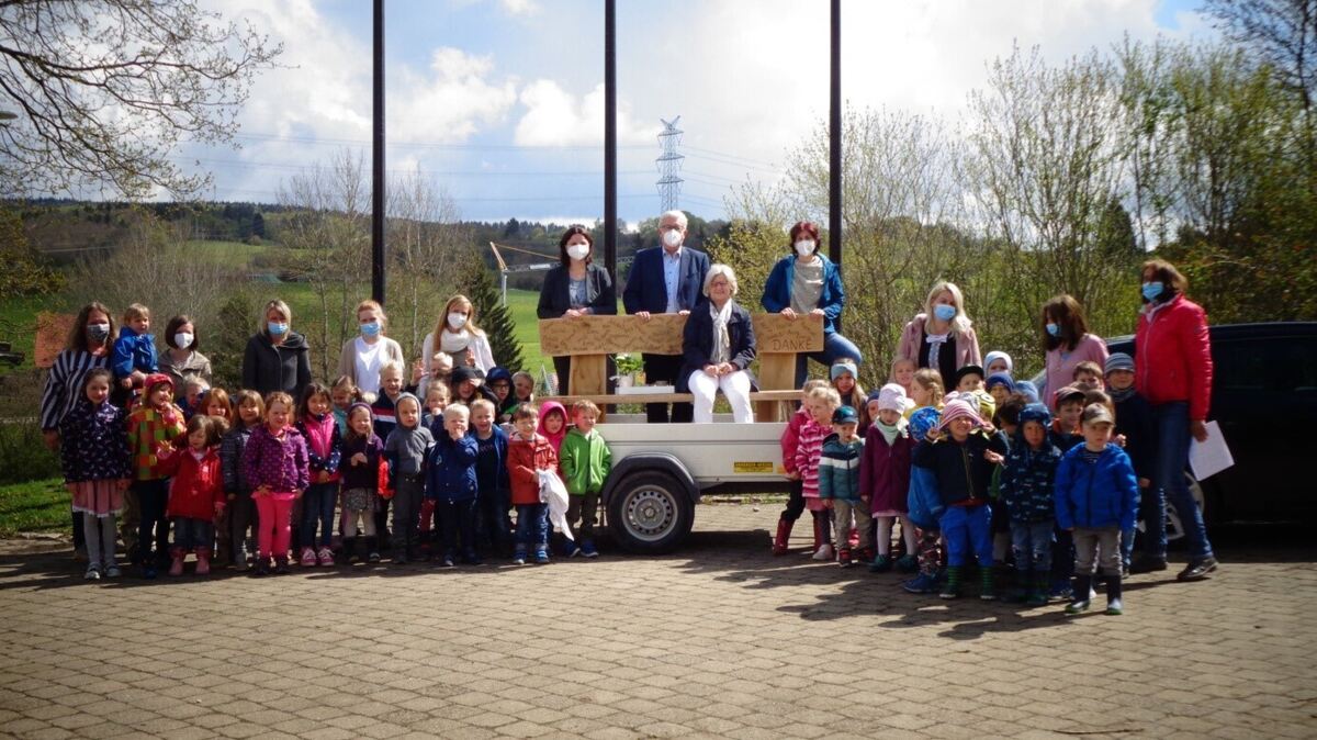 Die Elternvertreter Irina Hesche und Matthias Tilk überraschten die Erzieherin mit einer selbst gebauten Holzbank, in der alle Namen der aktuellen Kinder verewigt sind. Unter anderem soll sie dieses besondere Geschenk auch künftig an die Gomadinger Kinder und an vergangene Zeiten erinnern. (fm)