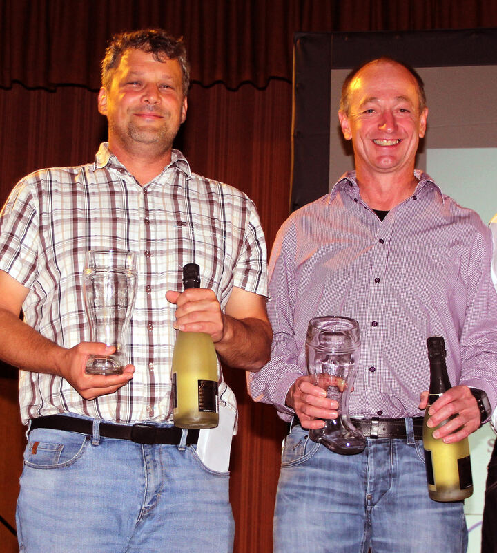 Rolf Alber (links) und Roland Vöhringer wurden für jahrzehntelange Tätigkeit beim FC Engstingen geehrt. FOTO: LEIPPERT