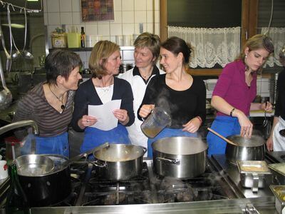 Bei munteren Gesprächen und Hildegard-Zutaten wird der Kochkurs mit Inge Tress (Mitte) zum Happening am Herd.