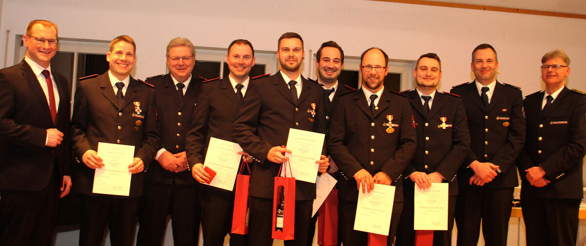 Die Geehrten mit Bürgermeister Mario Storz (von links): Christian Schenk, Gunter Hespeler, Andreas Staneker, Michael Speidel, Dennis Failenschmid, Benjamin Spothelfer, Matthias Leger und Kommandant Daniel Geist sowie Kreisbrandmeister Wolfram Auch. FOTO: LEIPPERT