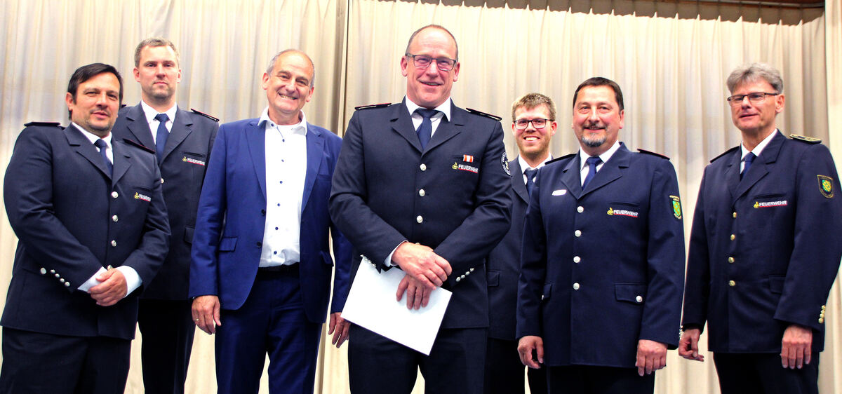 Jochen Fetzer (Mitte) erhält das Feuerwehr-Ehrenkreuz in Bronze im Kreise der Kameraden: Michael Schäfer (von links), Michael Saur, Bürgermeister Uwe Morgenstern, Joachim Maier, Markus Ott und Wolfram Auch. FOTO: LEIPPERT