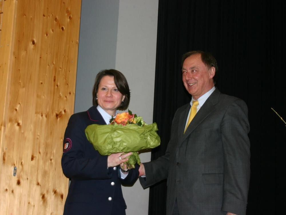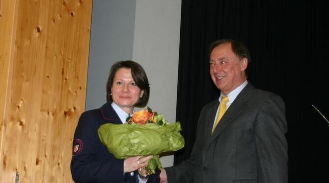Blumen für die Kommandantin: Bürgermeister Friedrich Bisinger dankte Barbara Eisele, die ihr Amt nun an Josef Brunner abgibt. FOTO: KÖPER