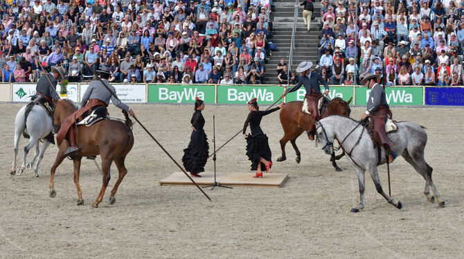 GOMADINGEN-MARBACH. Wieder einmal ist die Marbacher Hengstparade als ein funkelndes Pferdefest über die Bühne, respektive durch die ausverkaufte Arena gegangen. Die Marbacher und ihre vielen jungen und erfahreneren Gäste haben einmal mehr mit großem Ideenreichtum in den wunderschön inszenierten Schaubildern gezeigt, was sie auf die Beine bringen können. Dabei haben sie mit dem Gastland Spanien, das seine berühmten königlichen Reiter, Pferde und auch Tänzerinnen aus Cordoba geschickt hatte, besondere Partner zu Gast, die mit der Vorstellung ihrer traditionellen Reitkultur den Freundeskreis dieser Art der Pferdeausbildung bestimmt um einige Radien erweitern konnten. Gar nicht spanisch, aber zu Marbach gehörend wie die Einfahrt der Promis in historischen Kutschen, der Auftritt des Musikvereins Dapfen, der bereits ein Hofkonzert gegeben hatte und von der Stadtgarde zu Pferd Saulgau begleitet wurde.