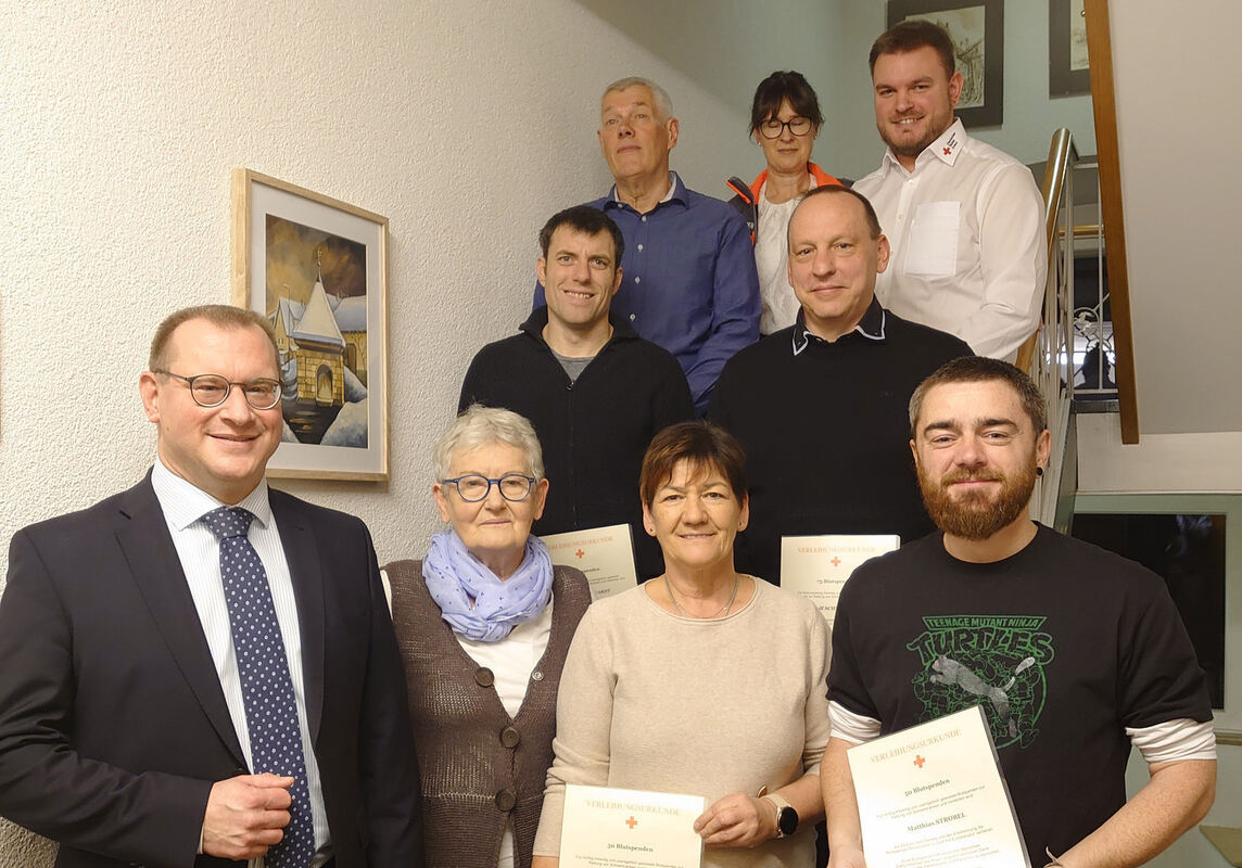 Einige der Geehrten mit Bürgermeister Mario Storz (links) und Sandra Eisele und Janis Tröster vom DRK.