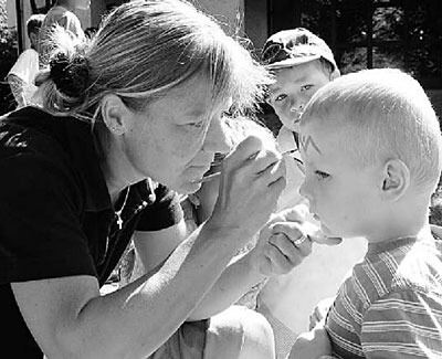 Jonas lässt sich von Beate Bittner in einen Indianer verwandeln.