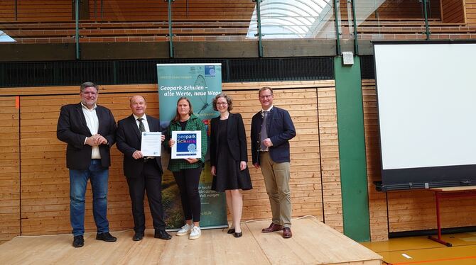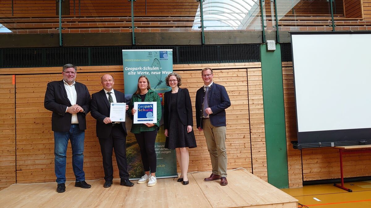 Landrat Ulrich Fiedler, Rektor Uwe Stark, Lehrerin Marie-Luise Aichele, Geopark-Geschäftsführerin Sibylle Knapp und Bürgermeister Mario Storz bei der Übergabe der Geopark-Plakette.