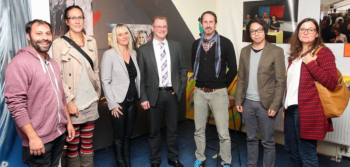 Feierten gemeinsam das zehnjährige Bestehen der Jugendhaus-Kooperation zwischen Gemeinde und der Mariaberger Ausbildung & Service: Jugendberater Xhavit Mustafa (von links), Nadine Hempke, Regioleitung Jugendarbeit, Gabriele Treiber, Schulsozialarbeiterin, Bürgermeister Mario Storz, Cord Dette, Fachbereichsleiter Jugendarbeit, Khang Huynh, Schulsozialarbeiter, und Christine Scheel, Geschäftsführung. FOTO: BAIER