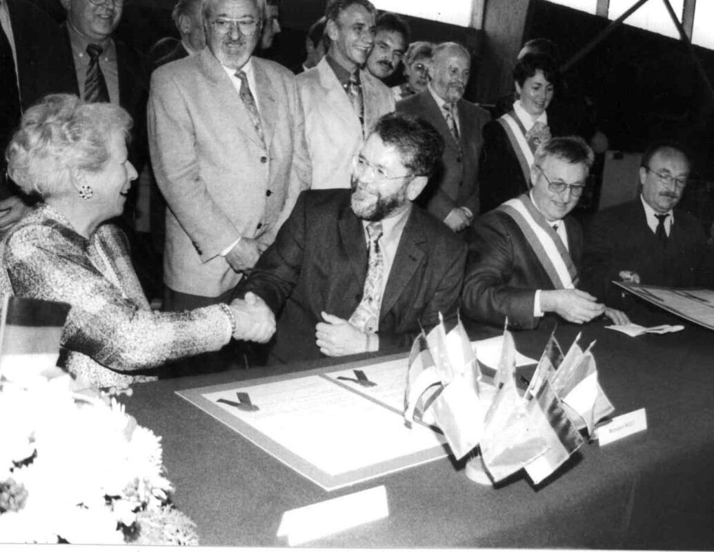 Die Partnerschaftsurkunde ist unterzeichnet. Gemeinsam freuen sich (von links) Laure Desforges, St. Johanns früherer Bürgermeister Eberhard Wolf, Marcel Blais und Horst Roller. Der Festakt 1999 in Frankreich beendete eine mehrjährige Annäherungsphase zwischen den beiden Kommunen.
