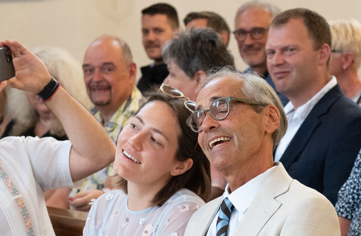 Matthias Kopp mit seiner Tochter Miriam beim Abschiedsgottesdienst. FOTO: TÜRK