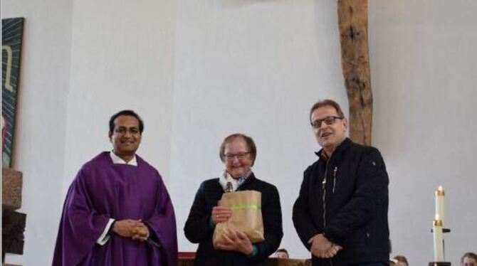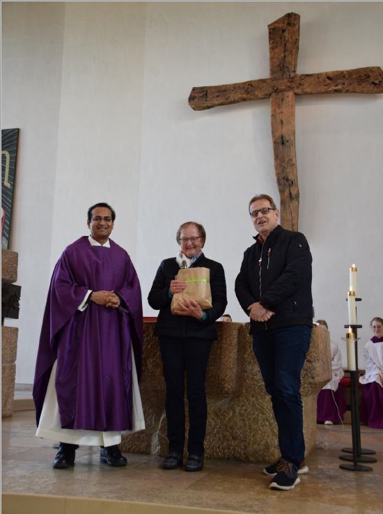 Pfarrer Georg Kallampalliyil und Frank Bob, der gewählte Zweite Vorsitzende des Pfarrgemeinderates, ehrten die Jubilarin mit einem Geschenkkorb und Ansprachen während einer Eucharistiefeier in der Katholischen Kirche Münsingen.