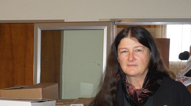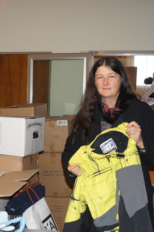 Belinda Kalender mit gespendeter Kinderjacke in ihrer Lagerhalle. FOTO: WURSTER
