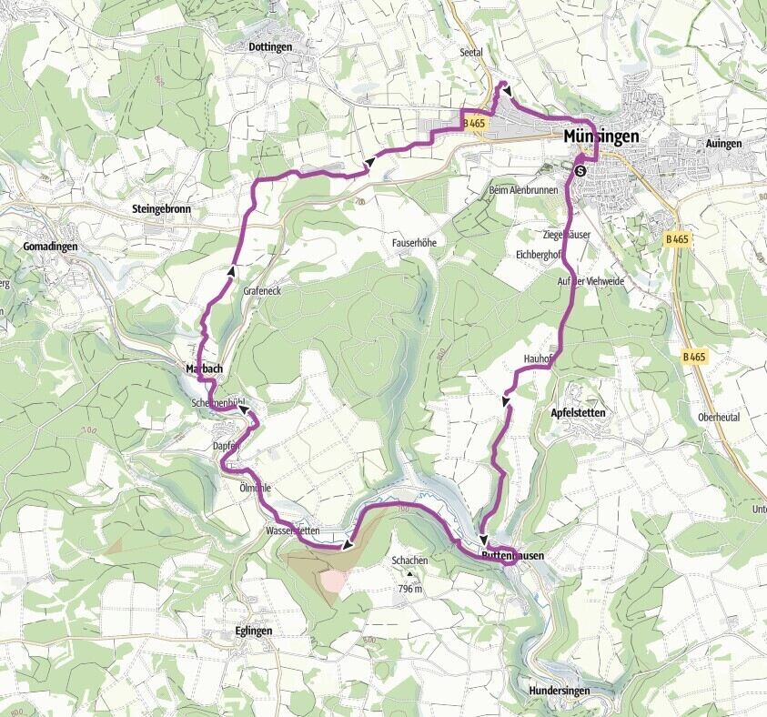 Die 26 Kilometer-Tour kann abgekürzt werden: ab Marbach einen Zug der Schwäbischen Alb-Bahn zurück nach Münsingen nehmen. KARTE: OPENSTREETMAP