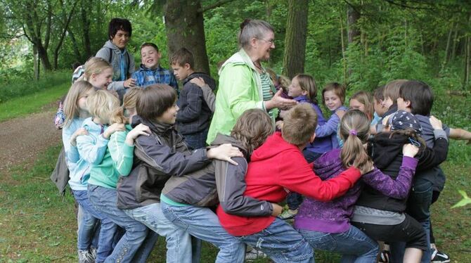 Mit Spielen hält Alb-Guide Maria Trittor (Mitte) die Viertklässler bei Laune.