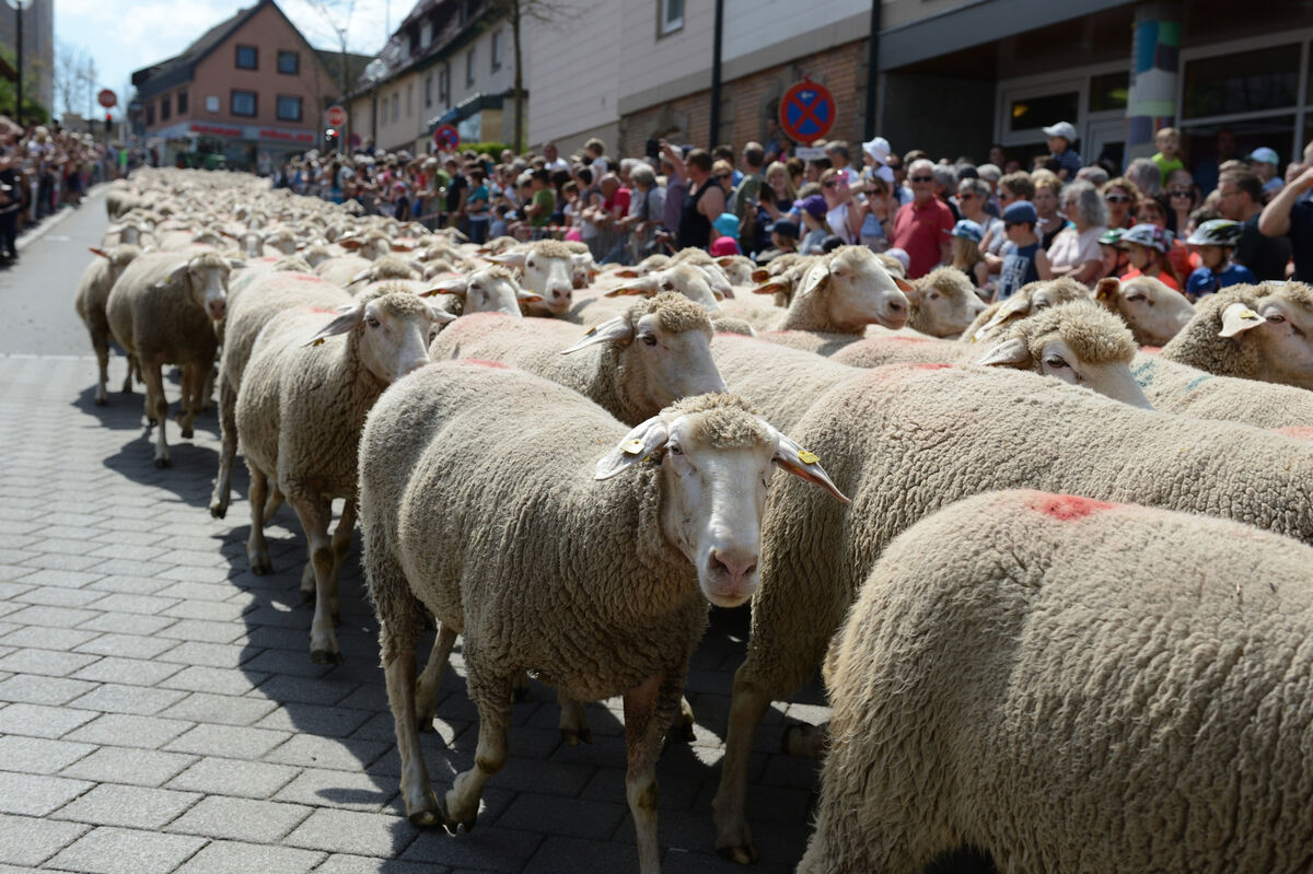 Gedrängel bei den Menschen, die Hälse und Handys reckten, Gedrängel bei den Schafen, denen diese ungewohnte Kulisse nicht ganz geheuer war und die sich lieber mitten in der Straße hielten. »Jetzt riecht man die Schafe auch«, meinte ein Besucherin lachend, nachdem die Herde halb vorüber war. Nur wenige Minuten dauerte die Begegnung – dann war der Höhepunkt des Münsinger Schafauftriebs auch schon wieder vorbei, wenn auf der Straße auch nicht ganz spurlos.