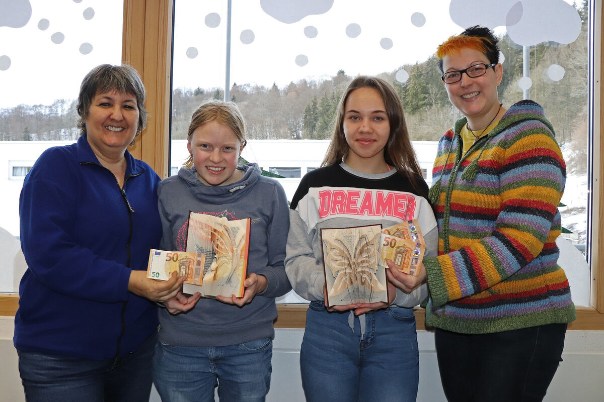Erika Seitz, Anika, Leonie und Kathrin Wecker (von links) von der Schülerfirma »Albfalter« haben Geld gefunden. FOTO: BLOCHING