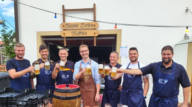 Freibier nach dem Fassanstich bei der Dorfhockete in Oberstetten. Von links: Manuel Roth, Alexander Waidmann, Marc Waidmann, Bürgermeister Simon Baier, Matthias Roggenstein, Adrian Zeller, Martin Holzhauer.
