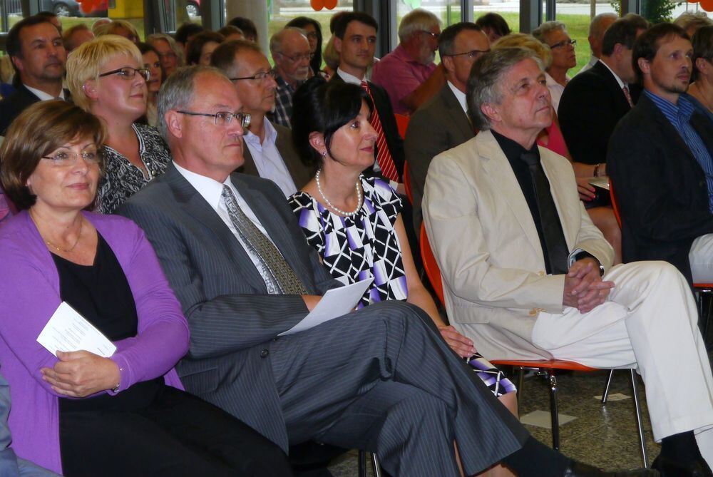 Vor dem Hintergrund zahlreicher Wegbegleiter: Ursula Bisinger, neue Rektorin des Schul-Verbundes, neben Herbert Winkler, seiner Frau Regina und Roland Frey (von links nach rechts). FOTO: BUTSCHER