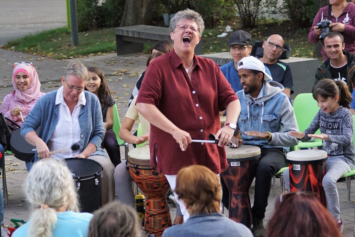 Chefin im Ring war Percussionistin Ricarda Raabe, die den dritten »Open Community Drum Circle« leitete. Eingeladen hatte die Musikschule Leichtle, die mit einigen Schülern, Lehrern und Ehemaligen ebenfalls auf die Pauke haute. Man spürte, dass die Trommelkunst jeden mitriss, denn rund die Hälfte der Teilnehmer machte spontan oder auf Einladung einfach mit.