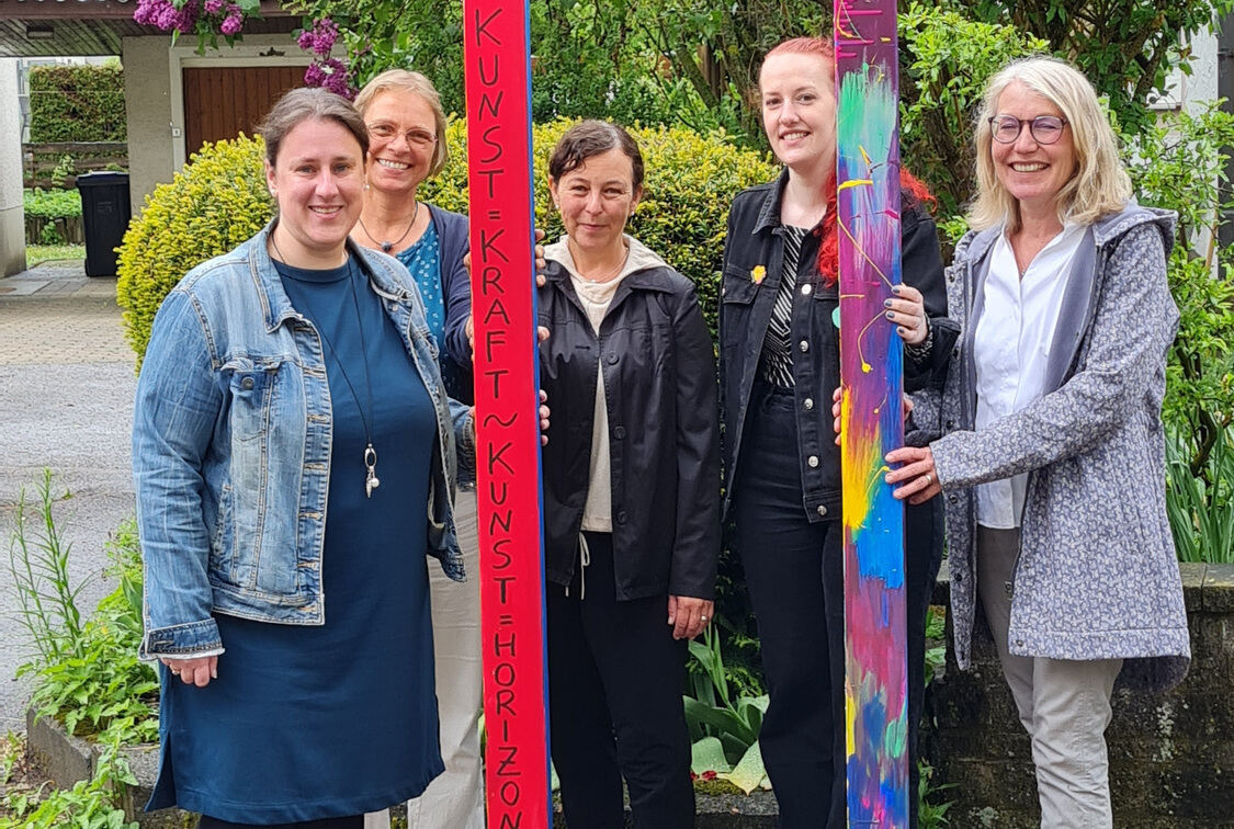 Organisieren die Kunst-Aktion auf dem Rathausplatz (von links): Rebecca Hummel (Stadt Münsingen), Gabriele Blum-Eisenhardt (Wohnpark Mitte, Samariterstiftung), Sarah Boger (Living Museum Buttenhausen, Bruderhaus-Diakonie ), Bianca Schrodin (Kunsttherapie Grafeneck, Samariterstiftung) und Ina Kinkelin-Naegelsbach (Diakonische Bezirksstelle Münsingen).