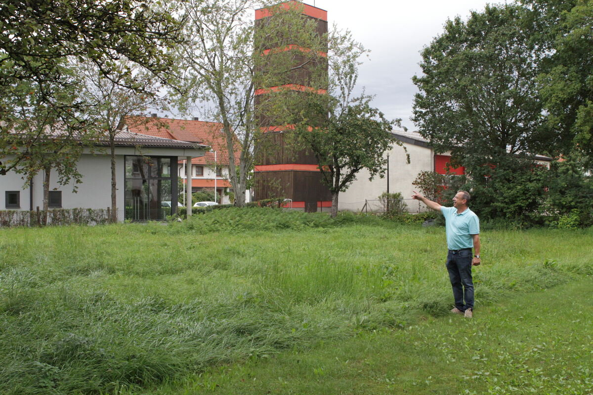 Zwischen Augstberghalle, Feuerwehrmagazin und Schule wird der Generationenplatz entstehen. Ortsvorsteher Alwin Ott setzt dabei auf umfangreiche Eigenleistung der Steinhilber Vereine. FOTO: SCHRADE