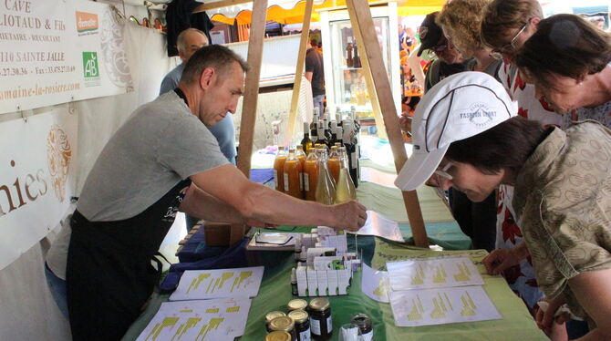 Für Besucher des Genussmarkts in Dapfen gibt es aber noch viel mehr als trocken Brot zu entdecken: Käse und Wurst, Wein, Gin, Leinöl, Saft, Honig aus der Region, Kräuter, Blumendeko, Produkte aus Alpakawolle, Nudeln, Ketchup, Brillen aus Wacholderholz, dazu noch Spezialitäten aus Gomadingens französischer Partnerstadt Buis les Baronnies. Es gibt Versucherle an vielen Ständen und genügend Verpflegung. Hungrig geht niemand aus Dapfen heim. »Wir gehen mit Genuss über den Markt. Hier herrscht einfach eine nette Atmosphäre, auch wenn der Genussmarkt schön längst kein Geheimtipp mehr ist«, sagen Elke Hiemisch und Berti Kurz aus Glems, die am Ende mit vollen Taschen und Rucksäcken aus Dapfen heimkehren werden. Tausende Besucher haben es ihnen am Wochenende gleich getan. (GEA)