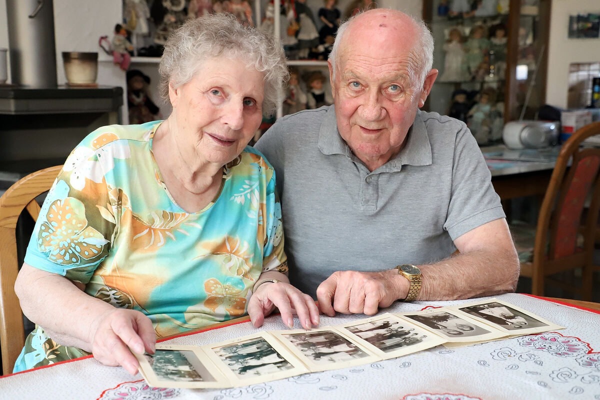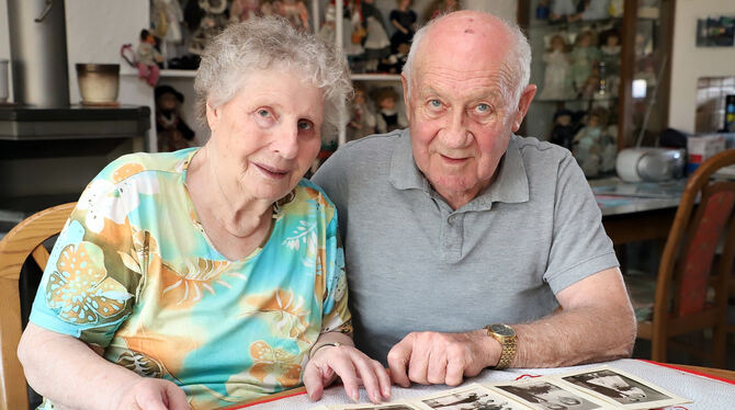 Eva Trautmann und ihr Mann Wilhelm mit alten Hochzeitsfotos. Die 83-Jährige hat bei Kriegsende 1945 eine dramatische Flucht aus Ostpreußen erlebt – Erinnerungen, die sie auch fast 75 Jahre später noch immer wieder verfolgen. FOTO: BAIER