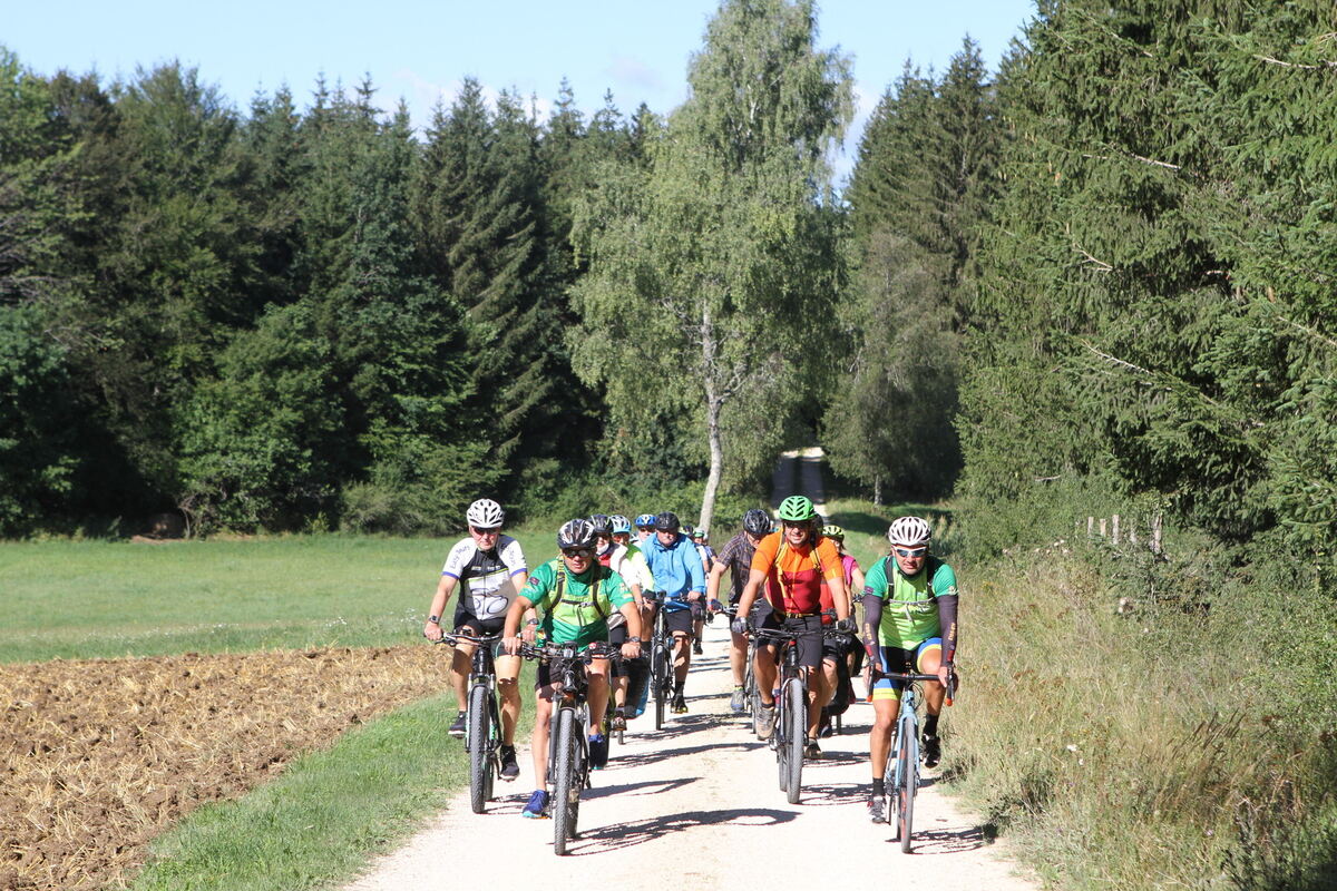 Tour 4 mit Start in Trochtelfingen, wo Alb-Gold-Chefin und Sponsorin Irmgard Freidler die Gruppe begrüßt und mit Kohlenhydraten für später in Form von Nudeln ausstattet, führt durch eine Gegend, die den meisten GEA-Lesern bekannt ist. Vom Alb-Gold-Firmengelände verläuft die Tour zunächst über Feld- wege über die Albhochfläche durch Wacholderheiden und Nadelwälder – perfekt fürs lockere Einradeln und erste kleine Kennenlern-Schwätzchen.