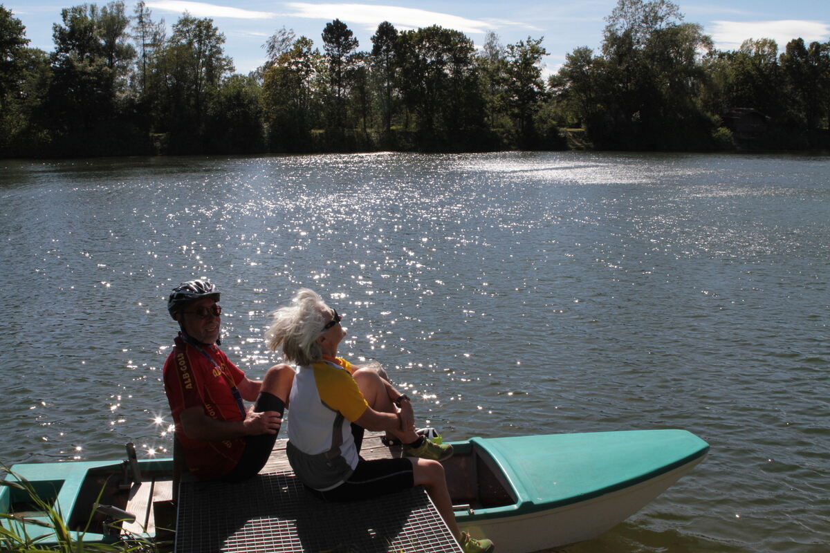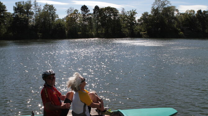 Einen Katzensprung weiter vereint sich das Flüsschen mit der Donau, die Radler drehen in Richtung Oberschwaben ab. Über Munderkingen geht’s schon wieder an ein Gewässer, dieses Mal an ein stehendes: Die Seen bei Rottenacker locken mit einem erfrischenden Bad – einer Versuchung, der drei Radler gerne nachgeben und kurz abtauchen. Die letzten Kilometer bringen die Radler wieder auf Betriebstemperatur, eine zusätzliche Motivation für den Endspurt ist die Einladung zu Vesper und Freibier bei der Berg-Brauerei, die die TransAlblust ebenfalls unterstützt.