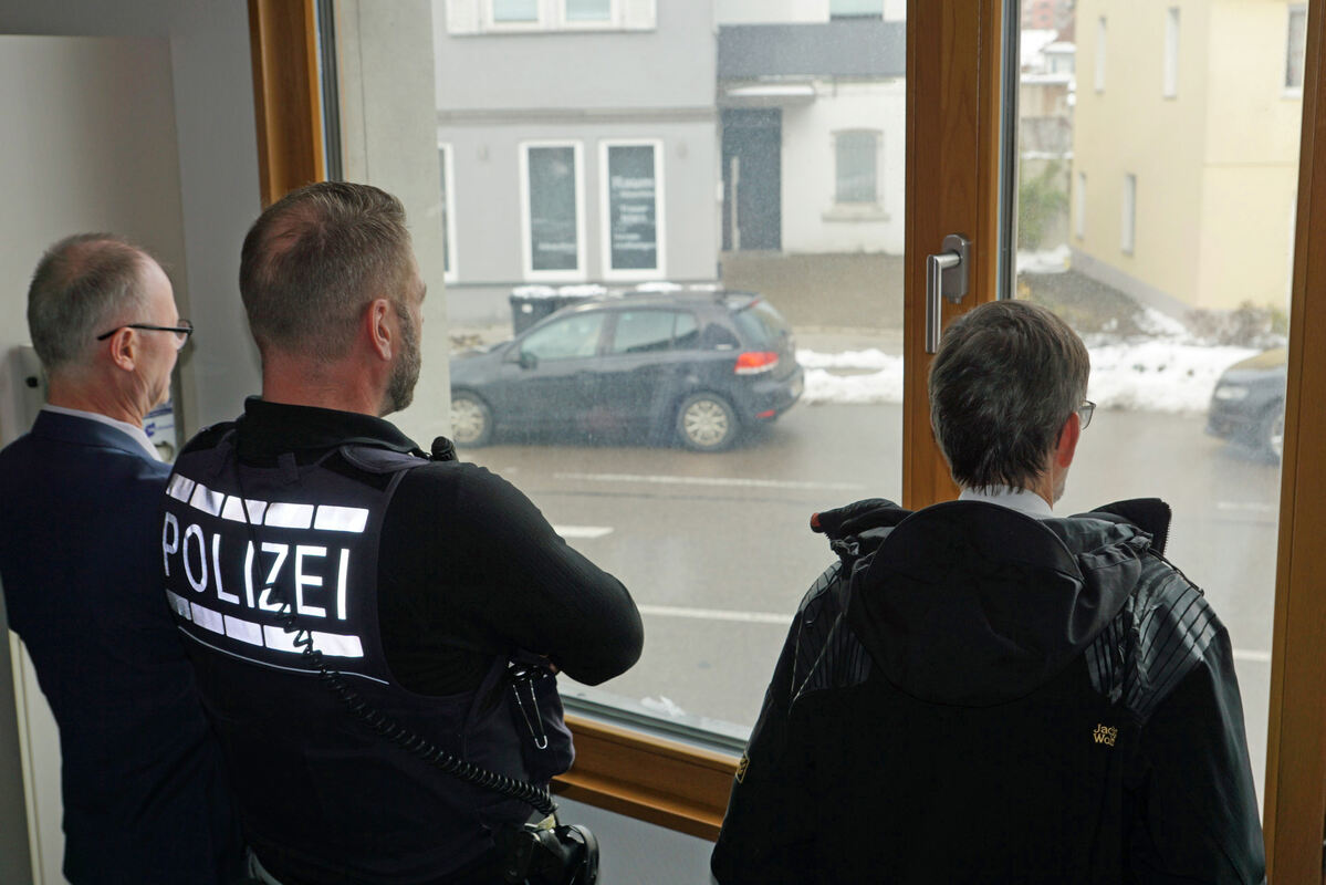 Ortstermin im Münsinger Polizeirevier: Rechtsanwalt Dieter Wandel (von links), der Polizeioberkommissar und Joachim Stahl, Direktor des Amtsgerichts Münsingen. FOTO: LENK