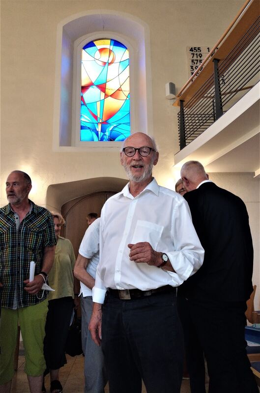 Einem Stifter, der ungenannt bleiben möchte, hat die Kirchengemeinde das neue Fenster mit seinem Motto »Soli deo gloria« (»Gott allein sei Ehr«) zu verdanken. Kirchengemeinderätin Susanne Mader dankte ihm und auch Rudi Hipp, der das Klarglas-Fenster als Stütze des Kunstwerks in vielen Stunden sorgfältiger Arbeit in die barocke Fensteröffnung eingepasst hatte. Verstorben im November 2021 habe Hipp die Fertigstellung leider nicht mehr miterleben können. Für die Kirchengemeinde sei der Prozess der Hinzufügung eines neuen Fensters in die denkmalgeschützte Kirche von 1777 ein »steiniger und lehrreicher Weg« gewesen. Erst nachdem die Genehmigungen von Denkmalamt und Landeskirche vorlagen, habe man beginnen können. (GEA)