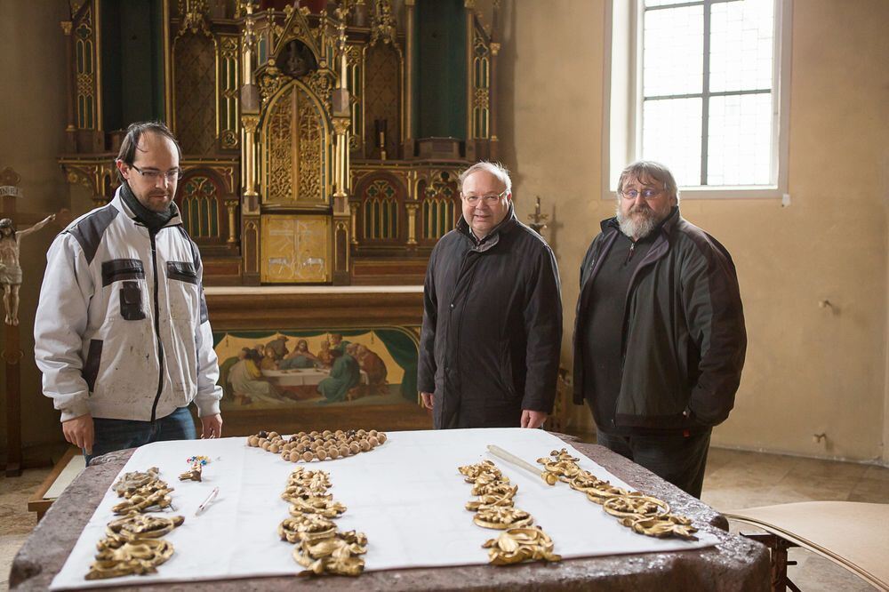 Restaurator Markus Ludwig, Pfarrer Wolfgang Jäger, von links, und Kirchengemeinderat Gerhard Sauter am Altar.