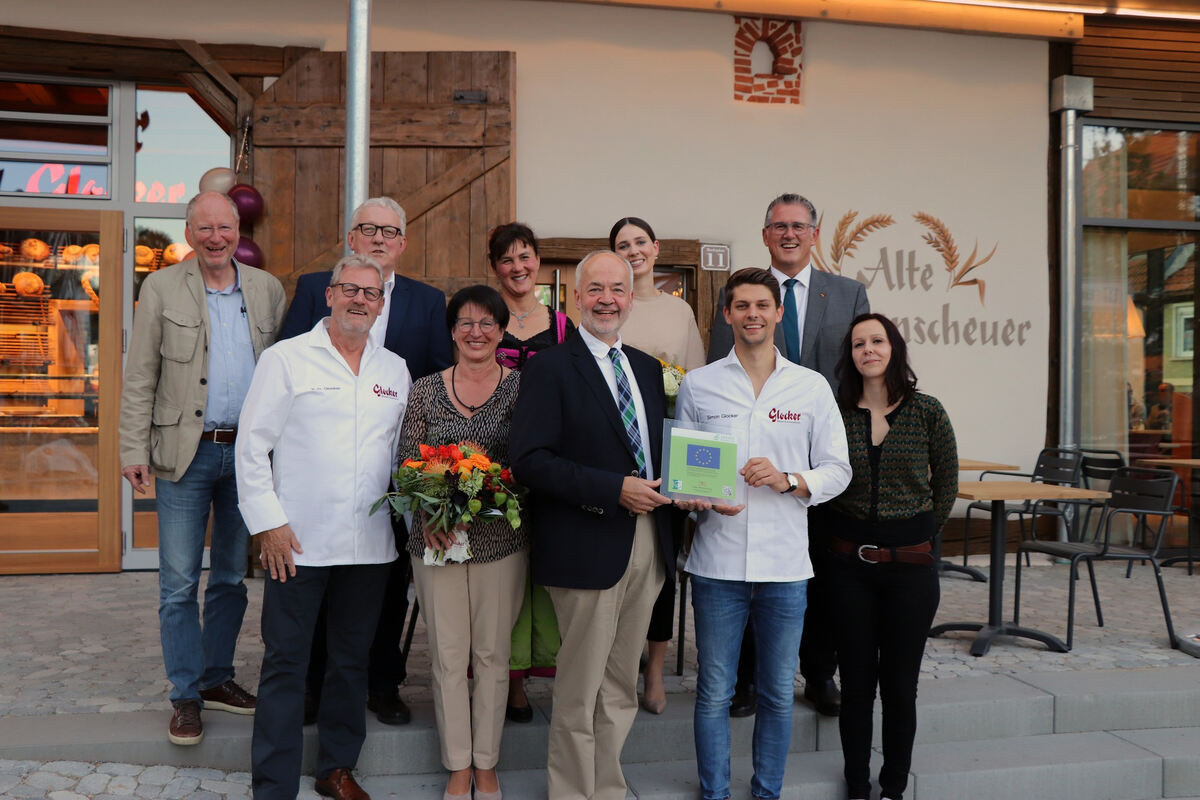 An der Mühlenscheuer (von links): hinten Architekt Andreas Hartmaier, Bürgermeister Klemens Betz, Kreislandfrauenchefin Pia Münch, Vanessa Glocker, MdB Michael Donth, vorn Klaus-Dieter und Roswitha Glocker, Landrat Thomas Reumann, Simon Glocker, Elisabeth Markwardt (Leader). foto: bloching