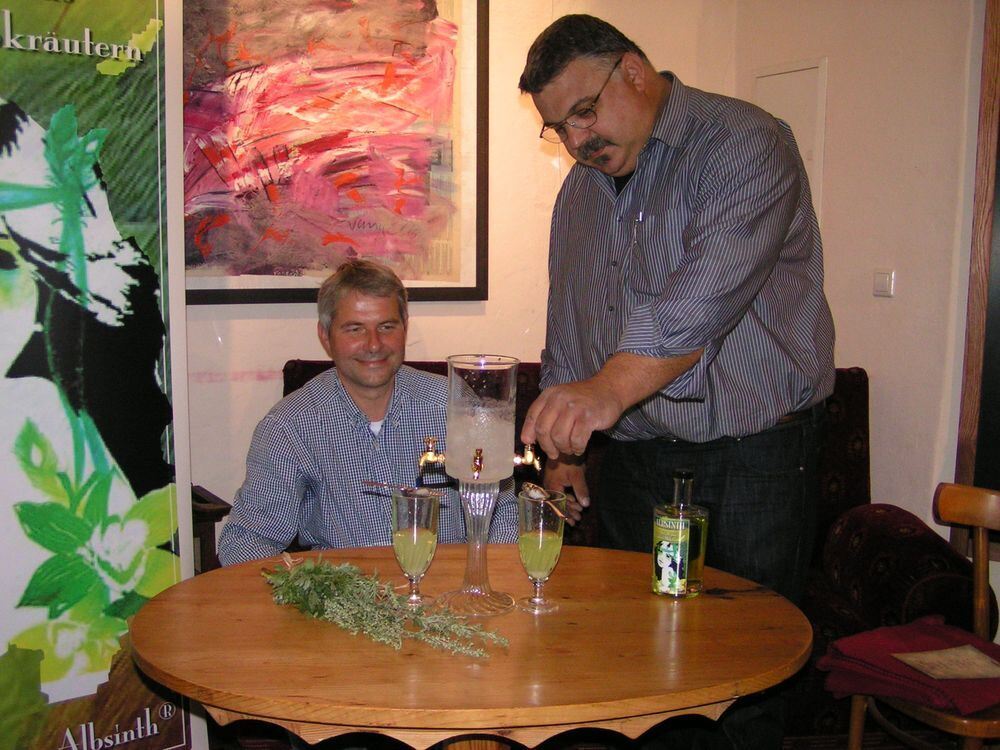 Stilvoll mit Zuckerstückchen und Eiswasser aus dem Brunnen zelebrieren Roman Lenz (links) und Gunter Hahn das Absinth-Trinkritual wie einst fürs Publikum. GEA-FOTO: GEIGER