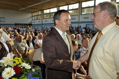 Händedruck für den Sieger der Bürgermeisterwahl in Pfronstetten: Rudolf Beck (rechts) gratuliert Reinhold Teufel, der ihn mit fast 74 Prozent der Stimmen deutlich geschlagen hat.