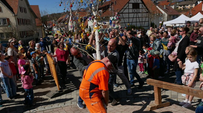 Die Erpfinger Ortschaftsräte waren gefordert beim Eierbaumaufstellen vor dem Rathaus.