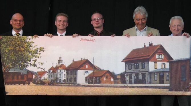 Der Vorstand des Vereins Schwäbische Alb-Bahn mit einem Bild des historischen Bahnhofs (von links): Bernd Matthias Weckler, Simon Niemann, Markus Schilling, Dieter Pesch und Heinz Kurz.