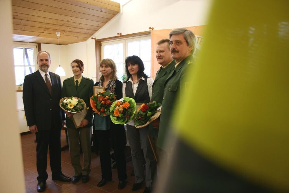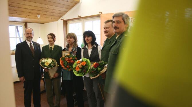 »Nichts ist wichtiger als Vorbilder«: Landrat Thomas Reumann (links) und Polizeidirektor Franz Lutz (rechts) zeichnen die vier Lebensretter (von links) Anja Pröger, Jutta Nikelski, Irene Härle und Dieter Peterhansel aus.
