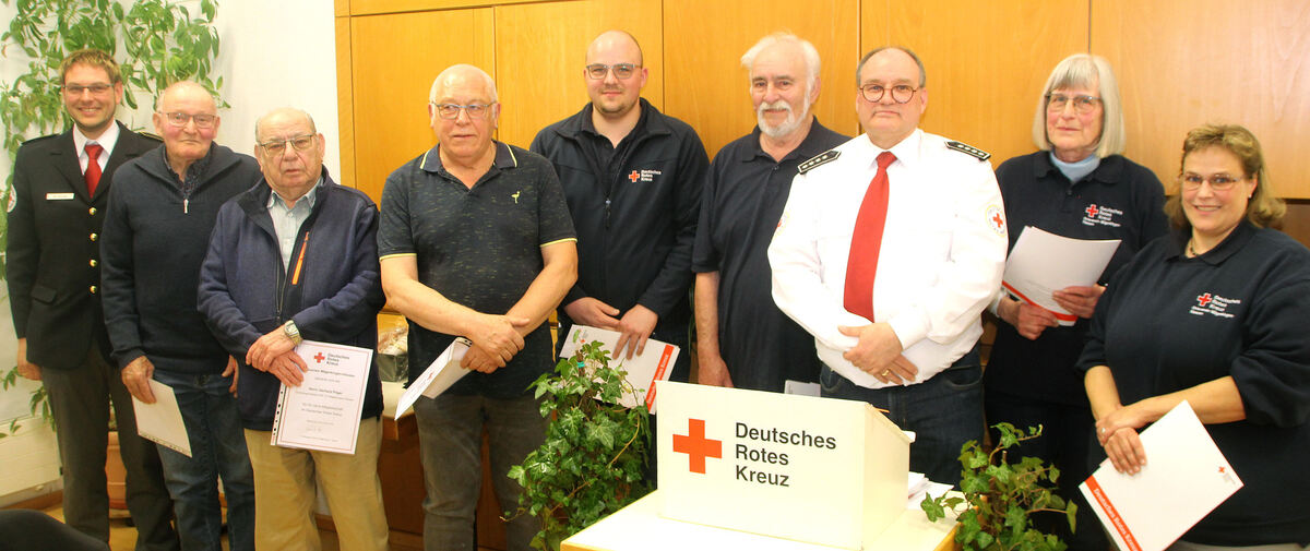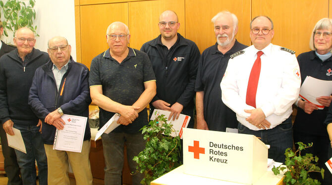 Die Geehrten des DRK-Ortsvereins Mägerkingen-Hausen mit dem stellvertretenden Kreis-bereitschaftsleiter Michael Gulde (links) und dem Vorsitzenden Eberhard Pilger (Dritter von rechts). FOTO: LEIPPERT