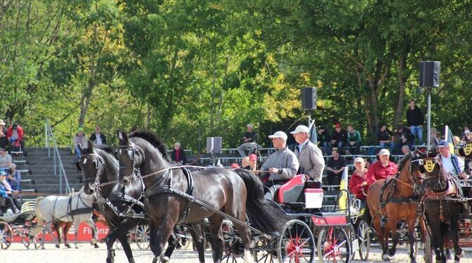 Fahrkunst in Vollendung zeigen 16 Gespannfahrer aus ganz Baden-Württemberg in der großen Zweispänner-Quadrille.
