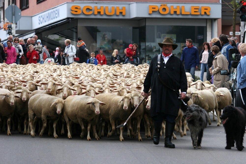 Von Zuschauern links und rechts der Straßen gesäumt. Der erste Münsinger Schafauftrieb durch die Stadt. Schäfer Gerhard Stotz vorneweg, die Herde blökend hinterher.