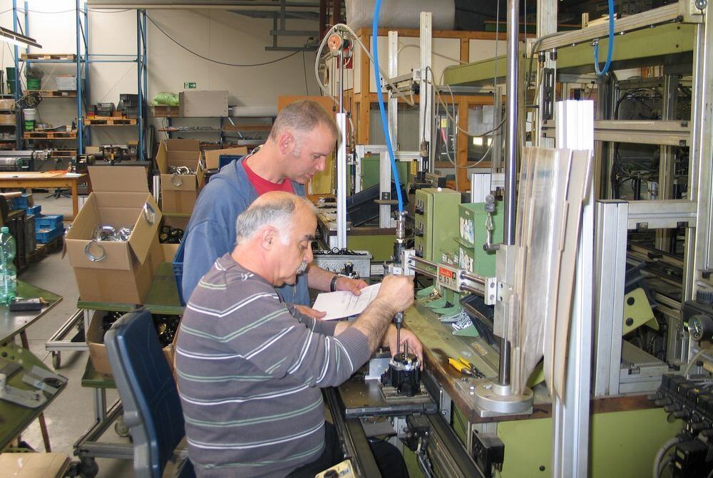 Der Arbeitserzieher und Abteilungsleiter in der Werkstatt der Samariterstiftung, Bernd Bahnmüller, vergleicht Auftrag und Ergebnis an der Maschine von Salman Ümek. GEA-FOTO: OELKUCH