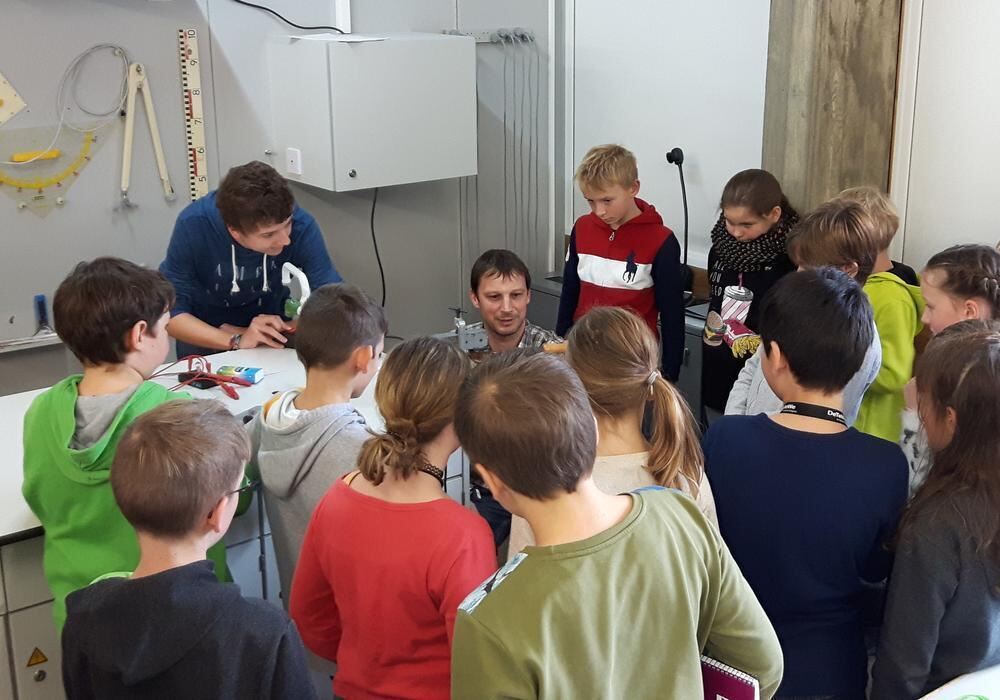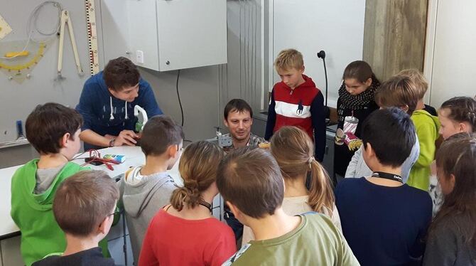 Auch das ist Förderung von Begabten und Interessierten: Münsinger Gymnasiasten bieten einen Physik-Schnupperkurs für Auinger Grundschüler an. Simon Daigler (in Blau) führt zusammen mit Lehrer Joachim Heinzelmann ein Experiment vor. FOTO: PRIVAT