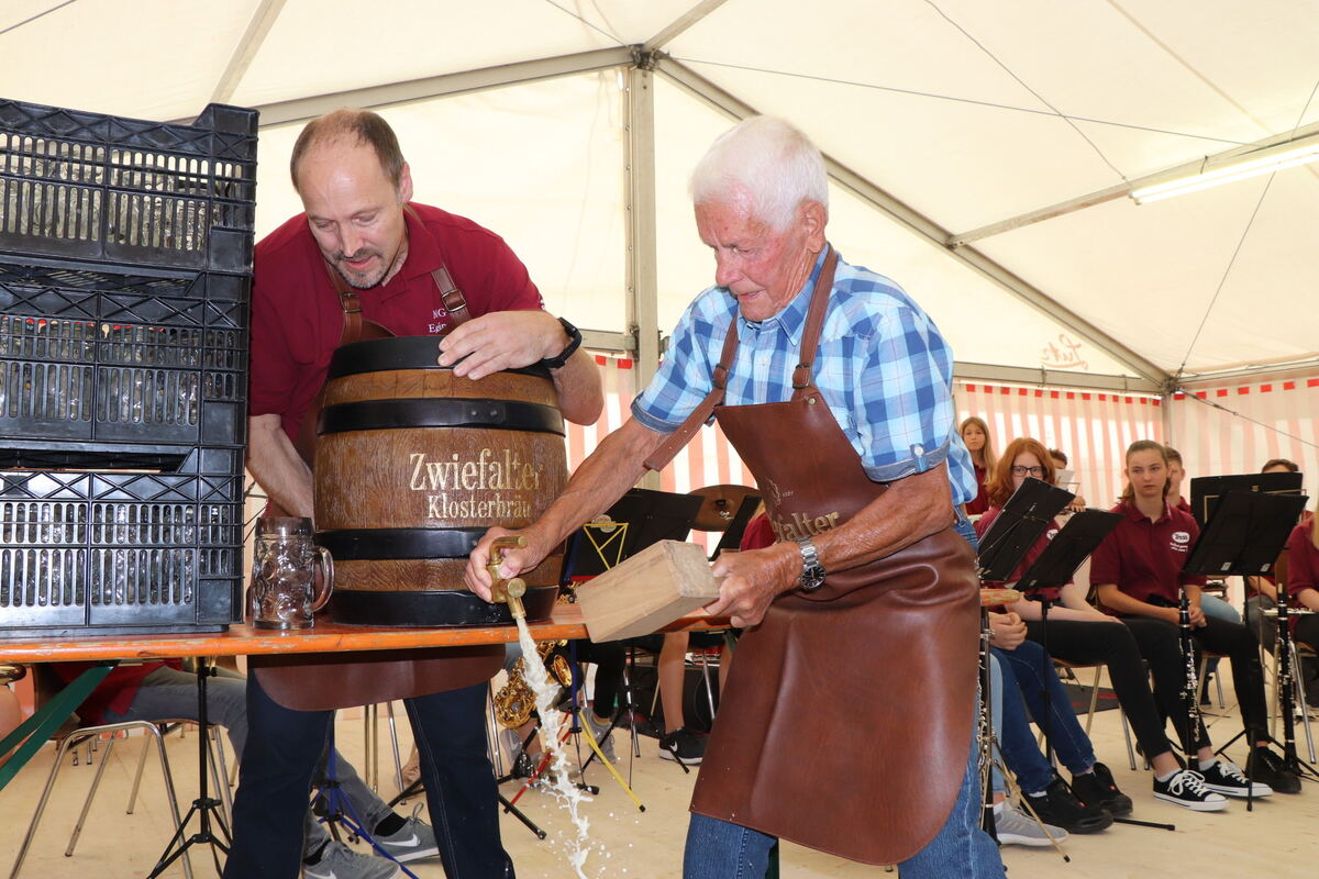 Der 87 Jahre alte Ehrenvorsitzende Bruno Heinrich hatte die Ehre, das Bierfass zum offiziellen Auftakt am Samstagabend anzustechen. Unter großem Applaus sprudelte der Gerstensaft bereits nach drei kräftigen und souveränen Schlägen, und das Freibier konnte gezapft werden. Musikalisch umrahmt wurde der Festauftakt von der Jugendkapelle Eglingen-Ehestetten. Am Abend sorgten die Musikkapellen aus Oberstetten und Dapfen mit zünftiger Blasmusik für Stimmung.