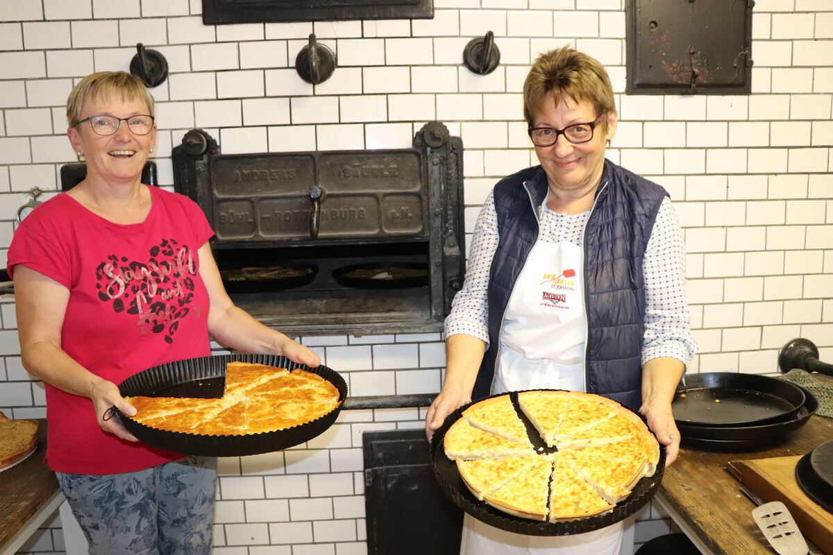 In Lonsingen wurde bereits zum 25. Mal gefeiert. Trotz frischer Temperaturen ließen sich am Samstagabend die zahlreichen Besucher gemütlich unter den großen Linden am Dorfplatz nieder, der von bunten Lampen in ein festliches Licht getaucht wurde. Gesangverein, Sportverein und Feuerwehr legten sich mächtig ins Zeug, um ihre Gäste aufs Beste zu verköstigen. Natürlich war dies mit auch der Verdienst der fleißigen Backfrauen, die bereits am Freitagabend mit dem Backen von Zwiebel- und Scherrkuchen begonnen hatten und bis Sonntag die beiden Holzöfen nicht kalt werden ließen. Rund 300 Laibe Brot wurden hier ein- und ausgeschossen und an die Besucher verkauft: »Wir haben immer sehr viel zu tun«, war von Brunhilde Buck zu hören, die gemeinsam mit ihrem Team die große Teigmaschine in Gang setzte, Zwiebeln klein hackte und den salzigen Hefeteig für den Scherrkuchen traditionell mit Kümmel, Salz und Butter bestrich. »Diese Teigmaschine haben wir vor einigen Jahren aus einem Anteil des Gewinns von der Hockete angeschafft«, erzählte sie.
