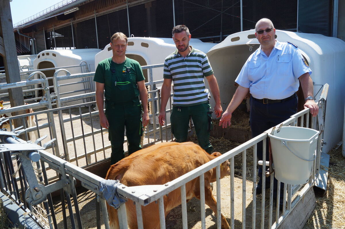 Wolfgang Geiselhart, Kai Rau und Gerhard Geckeler in einer Kälberbox.
