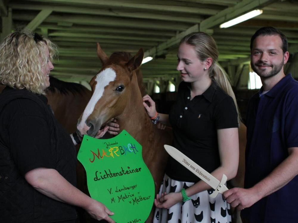 Ein edler Name für ein edles Ross: Gestütsmitarbeiterin Nicki Jannucci-Meyer, Louisa Fürstin von Urach und Gräfin von Württemberg und Eberhard Etter, Verwalter auf Schloss Lichtenstein, taufen den kleinen Hengst »Lichtensteiner«.
